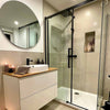Los perfiles de aluminio en elegante negro mate subrayan un diseño claro y moderno. Puede continuar con este aspecto fácilmente utilizando más elementos negros en su baño.
